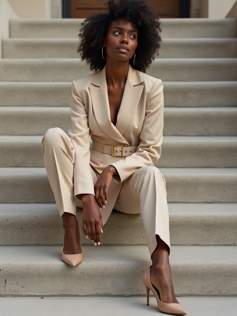 elegant model wearing a nude-colored belted pantsuit with high heels, posing on city steps, fashion photography, soft light and minimal background