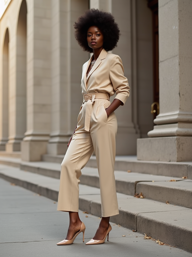 elegant model wearing a nude-colored belted pantsuit with high heels, posing on city steps, fashion photography, soft light and minimal background