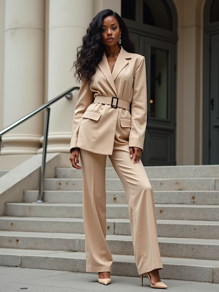 elegant model wearing a nude-colored belted pantsuit with high heels, posing on city steps, fashion photography, soft light and minimal background