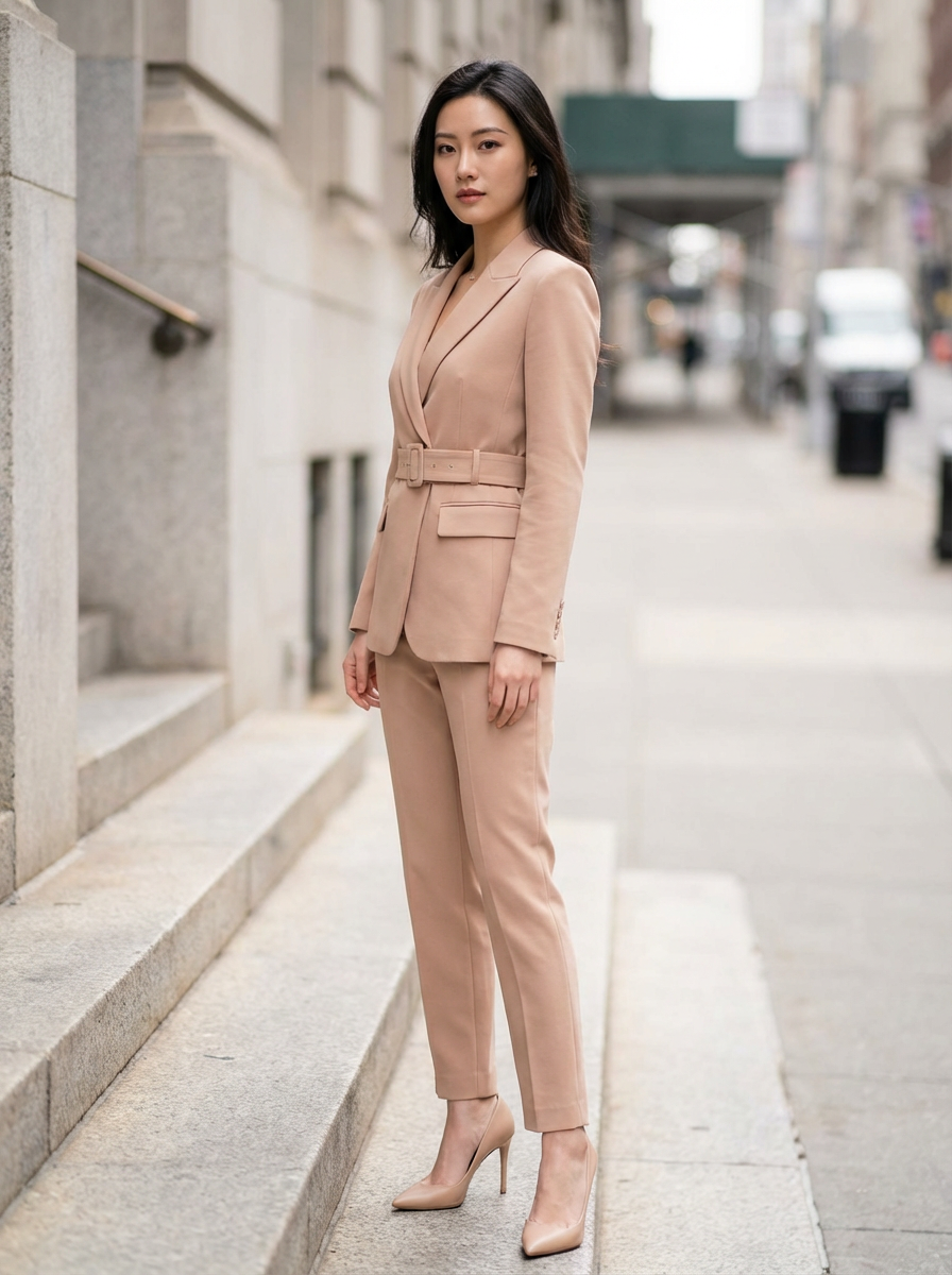 elegant model wearing a nude-colored belted pantsuit with high heels, posing on city steps, fashion photography, soft light and minimal background
