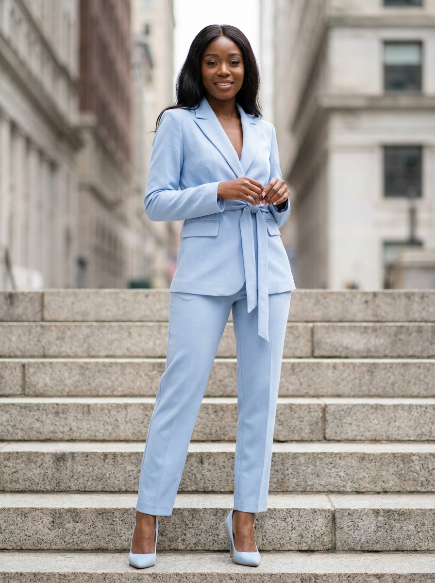 elegant model wearing a pastel blue belted pantsuit with high heels, posing on city steps, fashion photography, soft light and minimal background