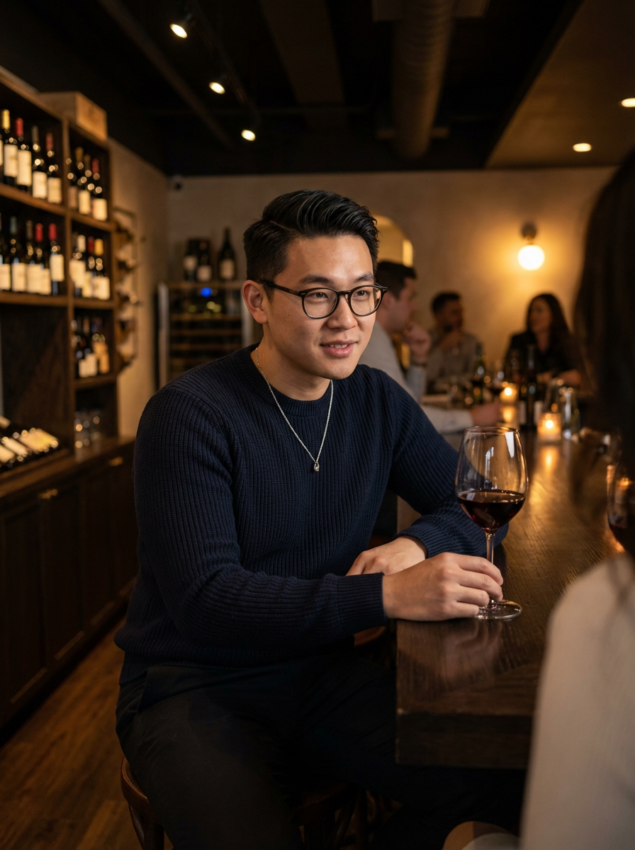 else{model at wine bar first date, nice sweater, holding drink, intimate lighting, sophisticated atmosphere}