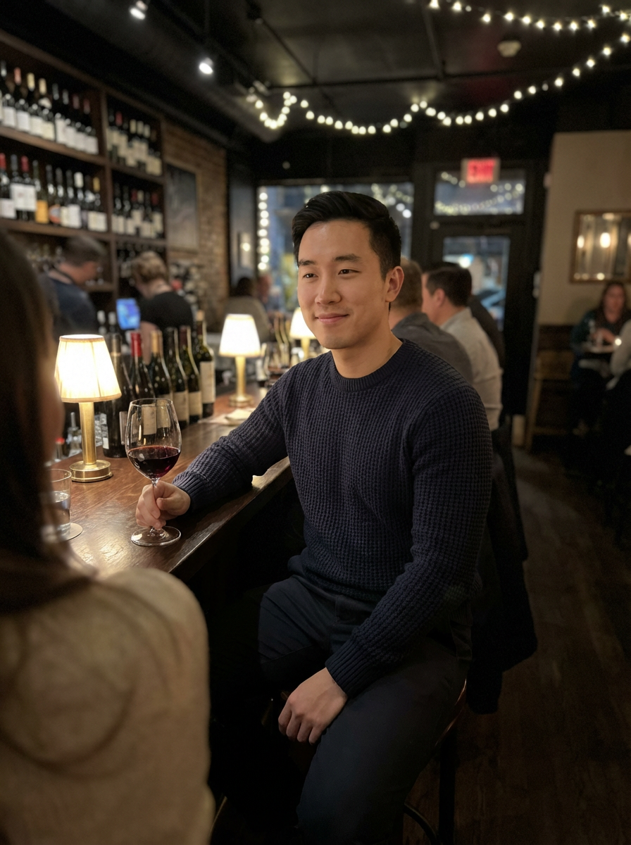 else{model at wine bar first date, nice sweater, holding drink, intimate lighting, sophisticated atmosphere}