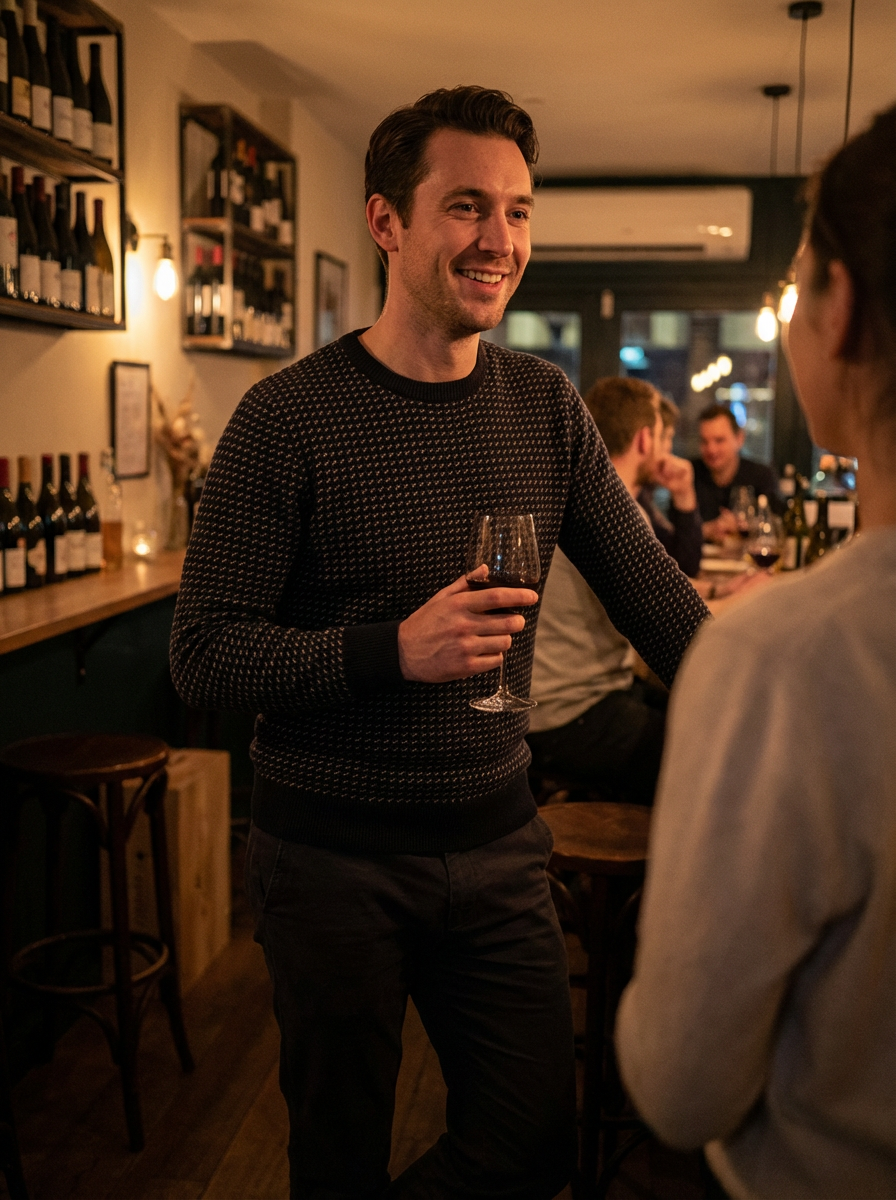 else{model at wine bar first date, nice sweater, holding drink, intimate lighting, sophisticated atmosphere}