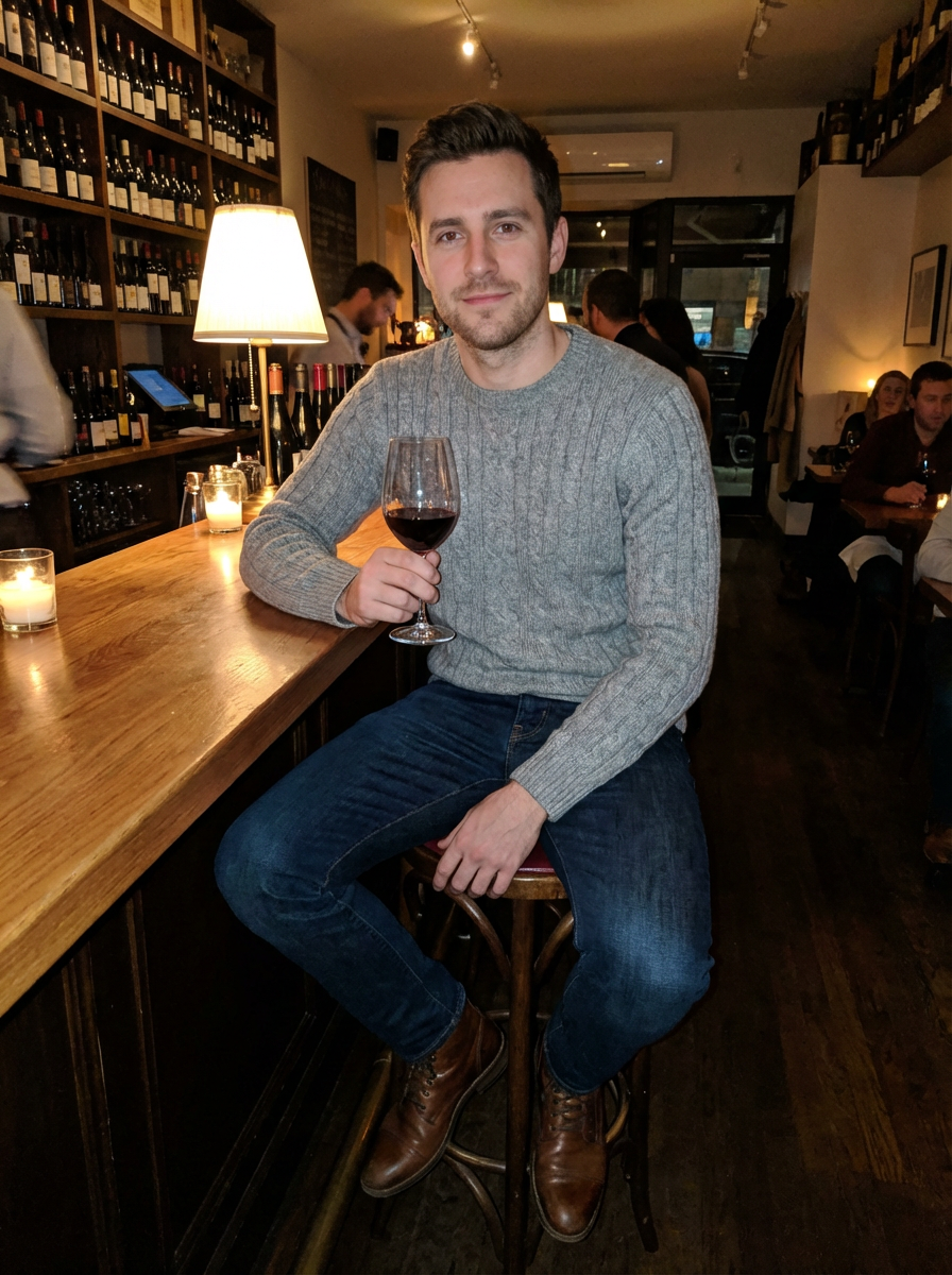 else{model at wine bar first date, nice sweater, holding drink, intimate lighting, sophisticated atmosphere}