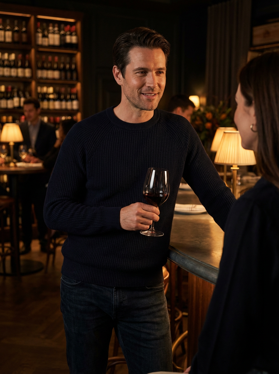 else{model at wine bar first date, nice sweater, holding drink, intimate lighting, sophisticated atmosphere}