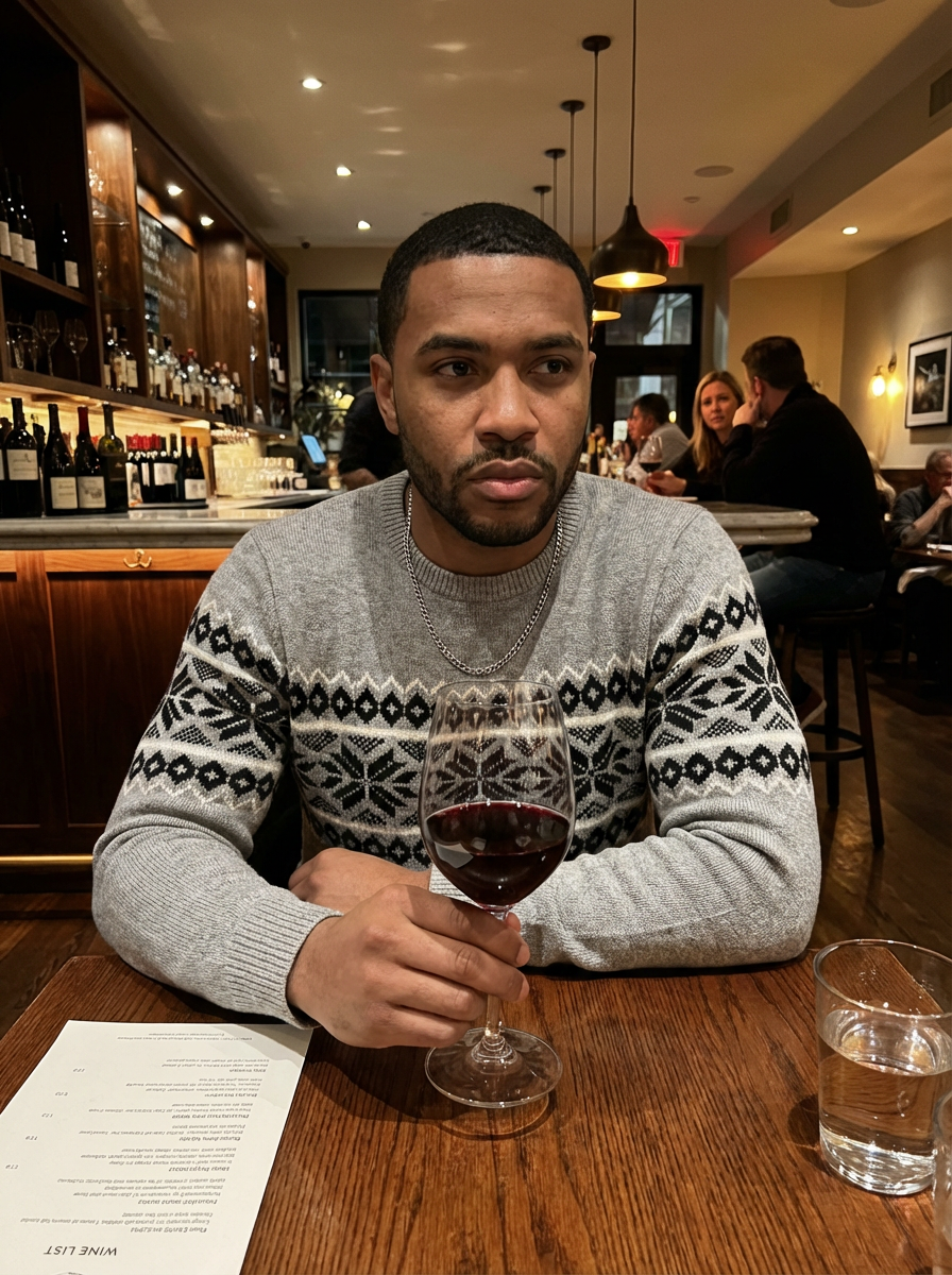 else{model at wine bar first date, nice sweater, holding drink, intimate lighting, sophisticated atmosphere}