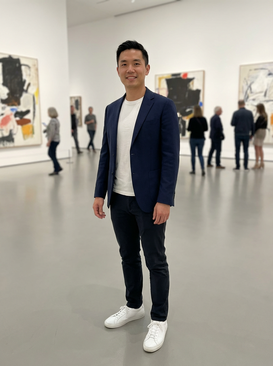 else{model for museum date look, blazer, nice t-shirt, clean sneakers, art gallery background}