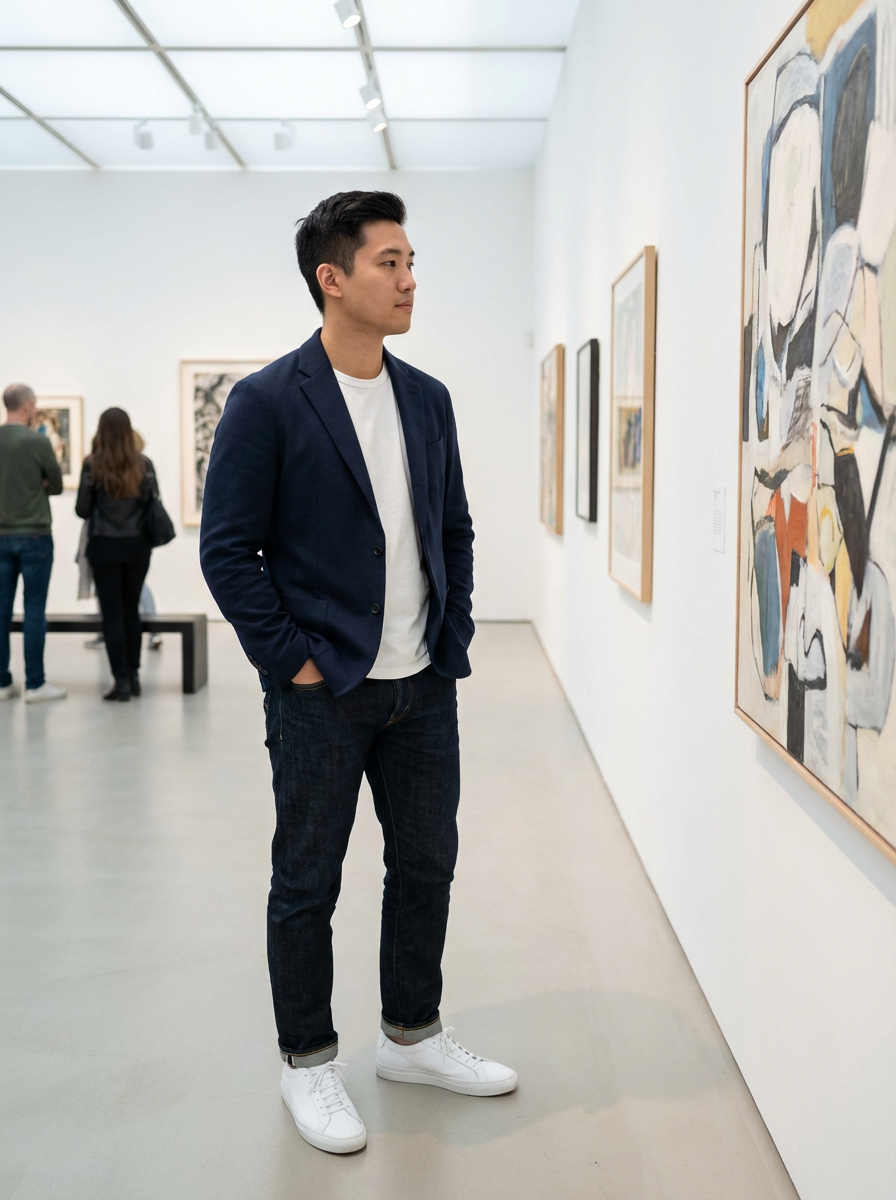 else{model for museum date look, blazer, nice t-shirt, clean sneakers, art gallery background}