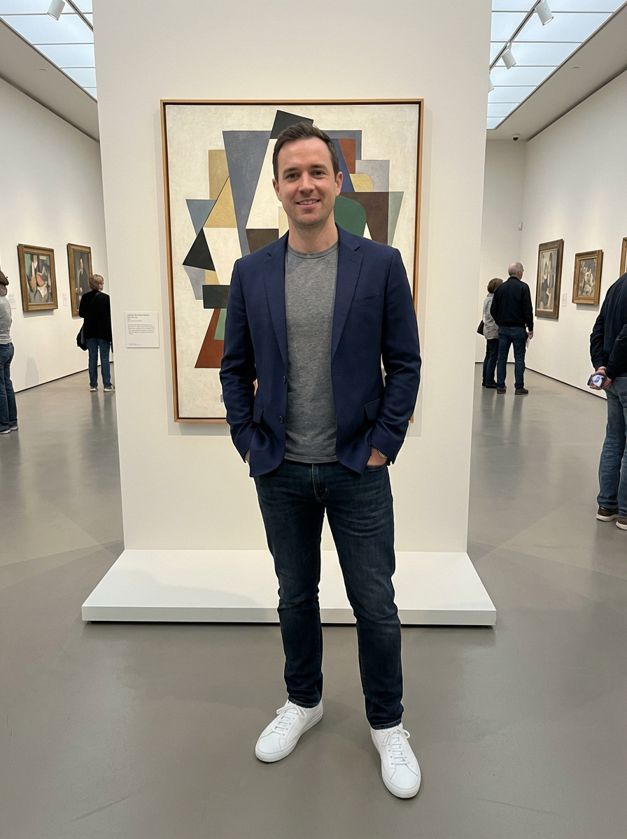 else{model for museum date look, blazer, nice t-shirt, clean sneakers, art gallery background}