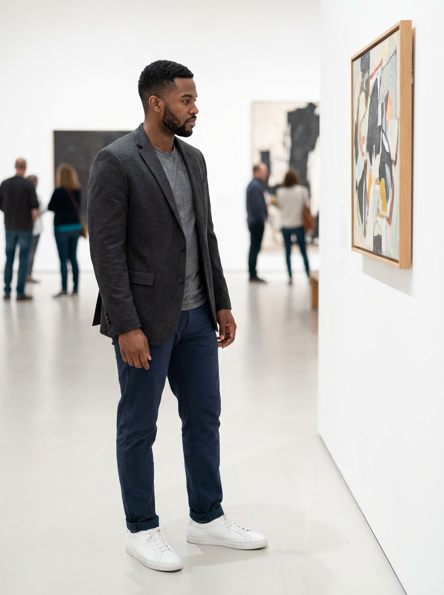 else{model for museum date look, blazer, nice t-shirt, clean sneakers, art gallery background}