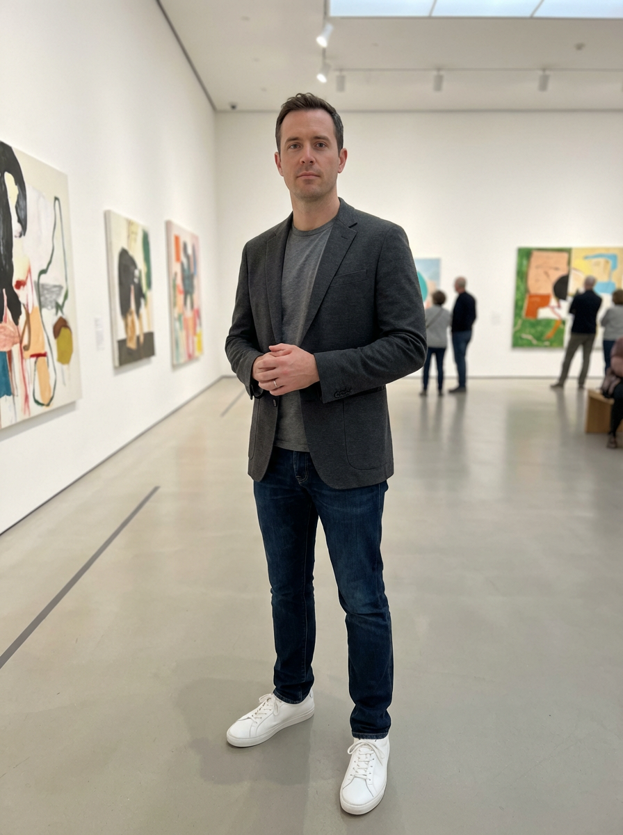 else{model for museum date look, blazer, nice t-shirt, clean sneakers, art gallery background}