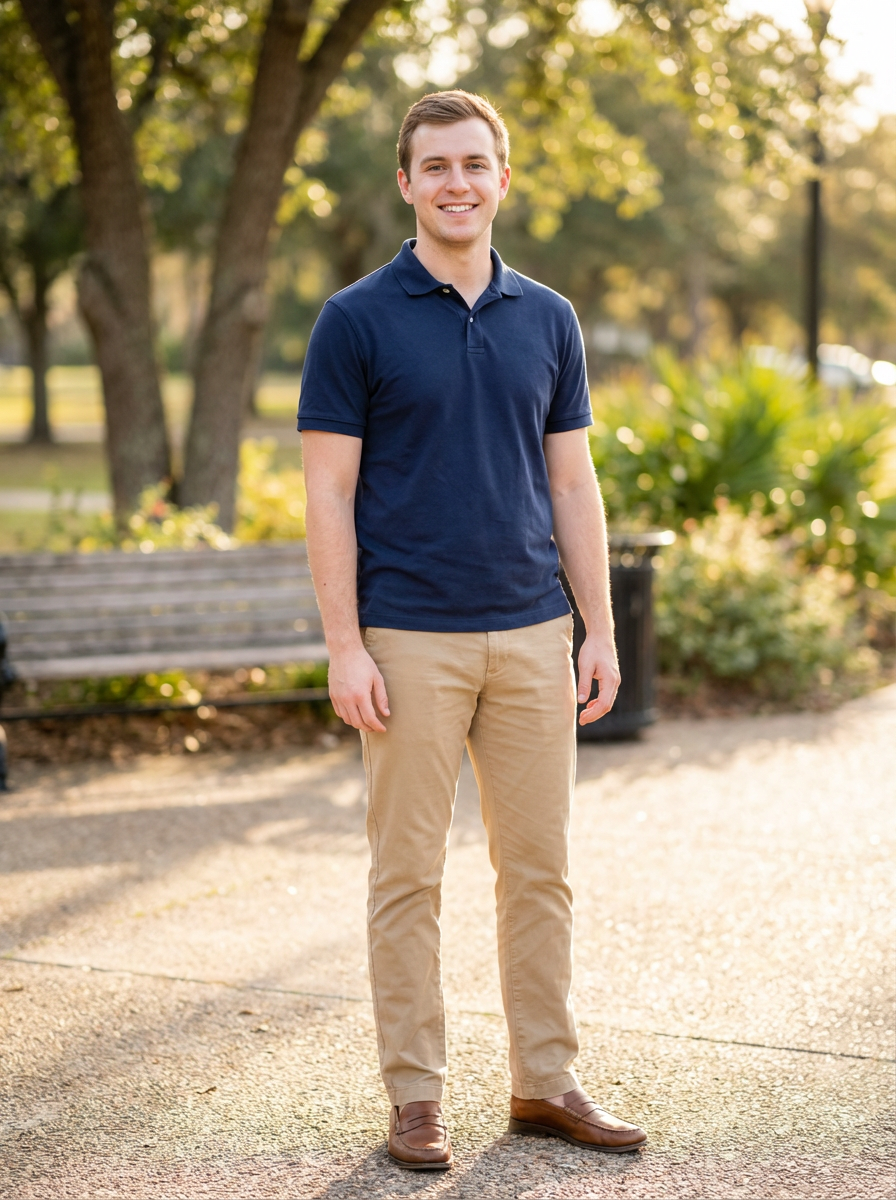else{model in casual first date look, polo shirt, khakis, friendly expression, park or outdoor setting}