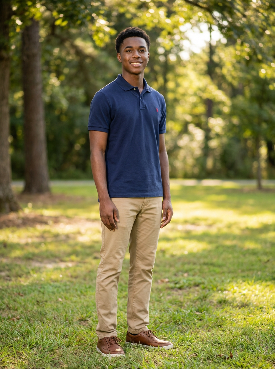 else{model in casual first date look, polo shirt, khakis, friendly expression, park or outdoor setting}