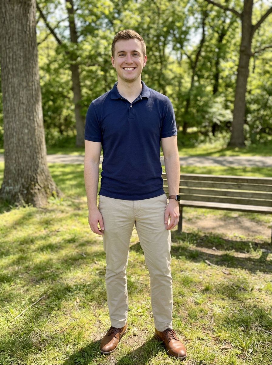 else{model in casual first date look, polo shirt, khakis, friendly expression, park or outdoor setting}