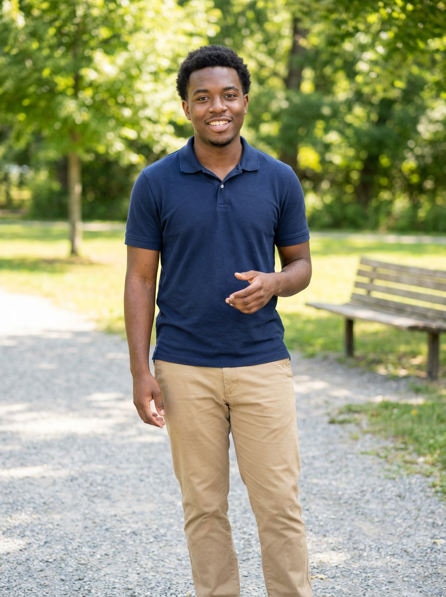 else{model in casual first date look, polo shirt, khakis, friendly expression, park or outdoor setting}