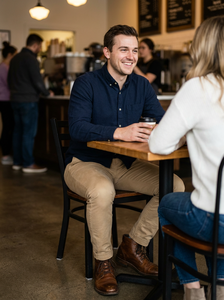 else{model in coffee shop first date outfit, button-up shirt, chinos, genuine smile, cozy cafe setting}