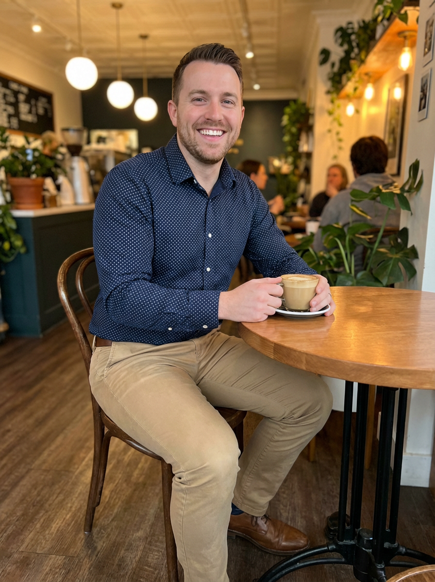 else{model in coffee shop first date outfit, button-up shirt, chinos, genuine smile, cozy cafe setting}