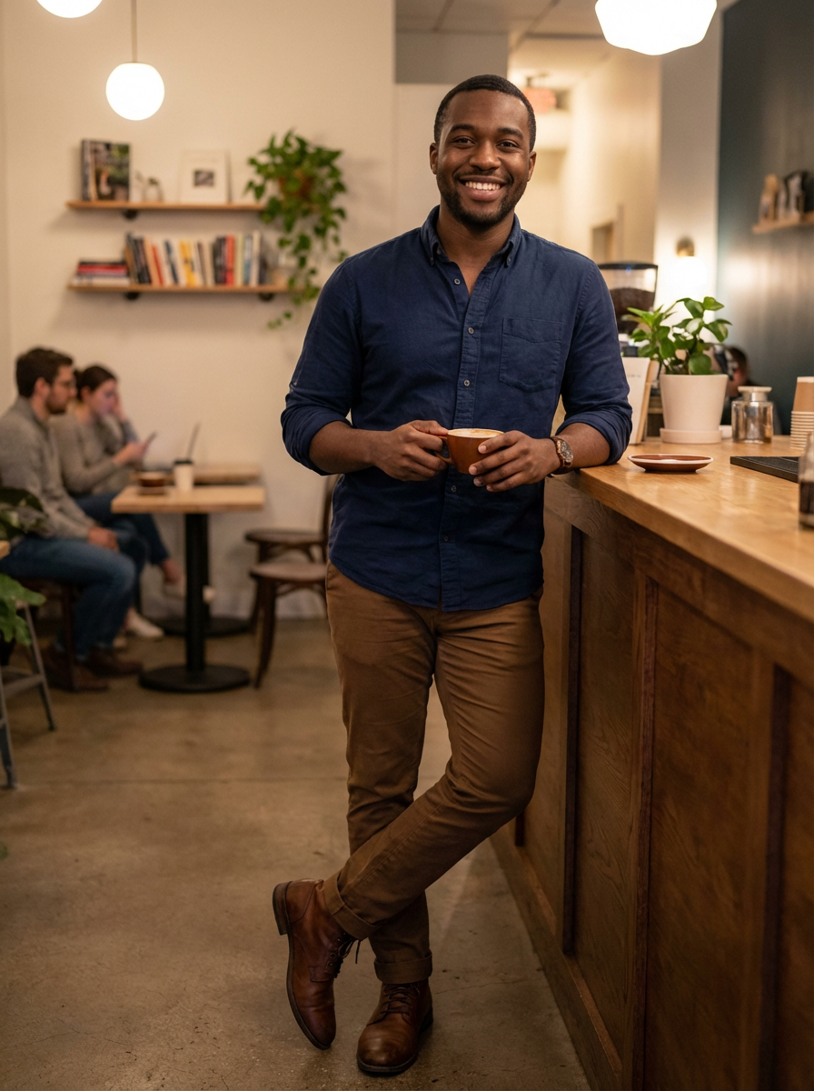 else{model in coffee shop first date outfit, button-up shirt, chinos, genuine smile, cozy cafe setting}