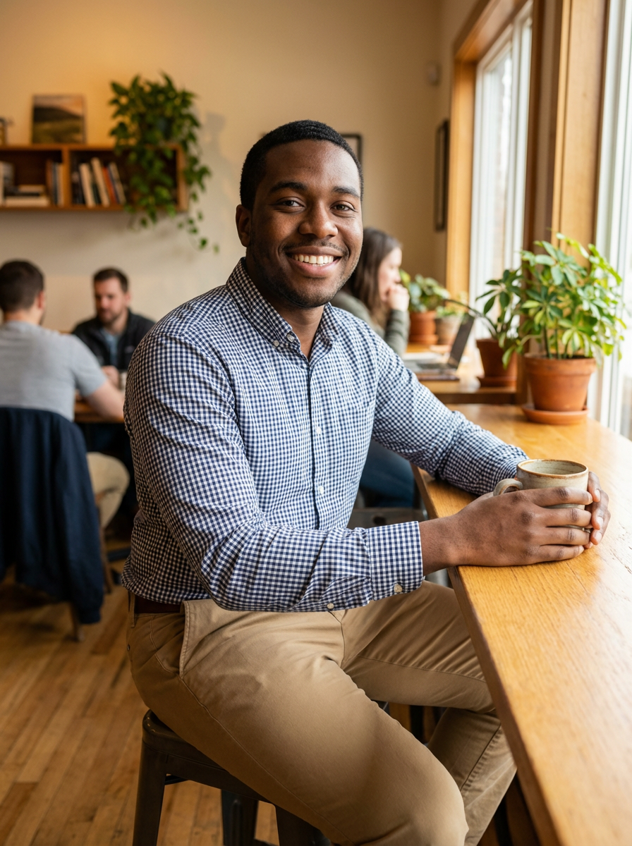 else{model in coffee shop first date outfit, button-up shirt, chinos, genuine smile, cozy cafe setting}