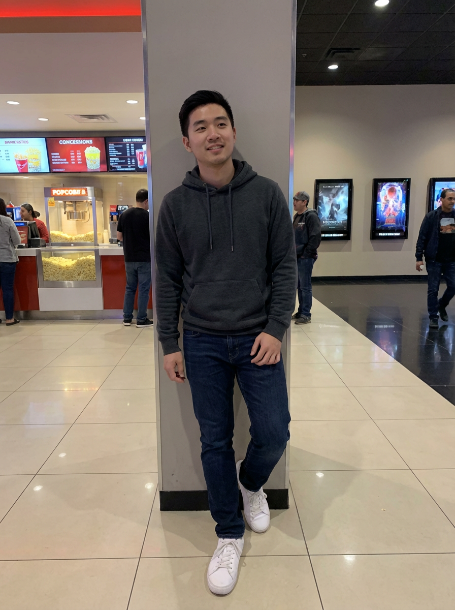 else{model in movie date casual, hoodie, jeans, relaxed pose, cinema lobby setting}