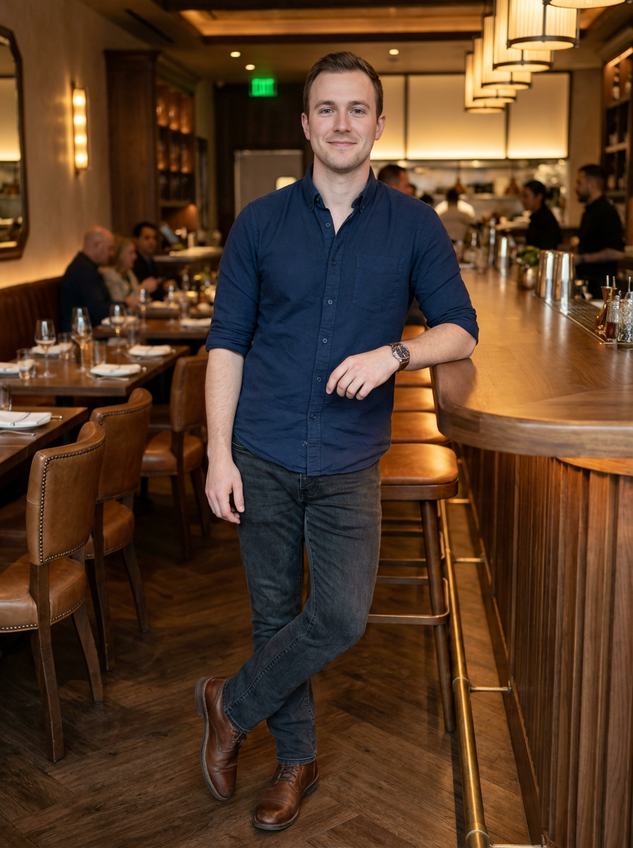 else{model ready for dinner date, dress shirt, dark jeans, relaxed stance, upscale restaurant background}