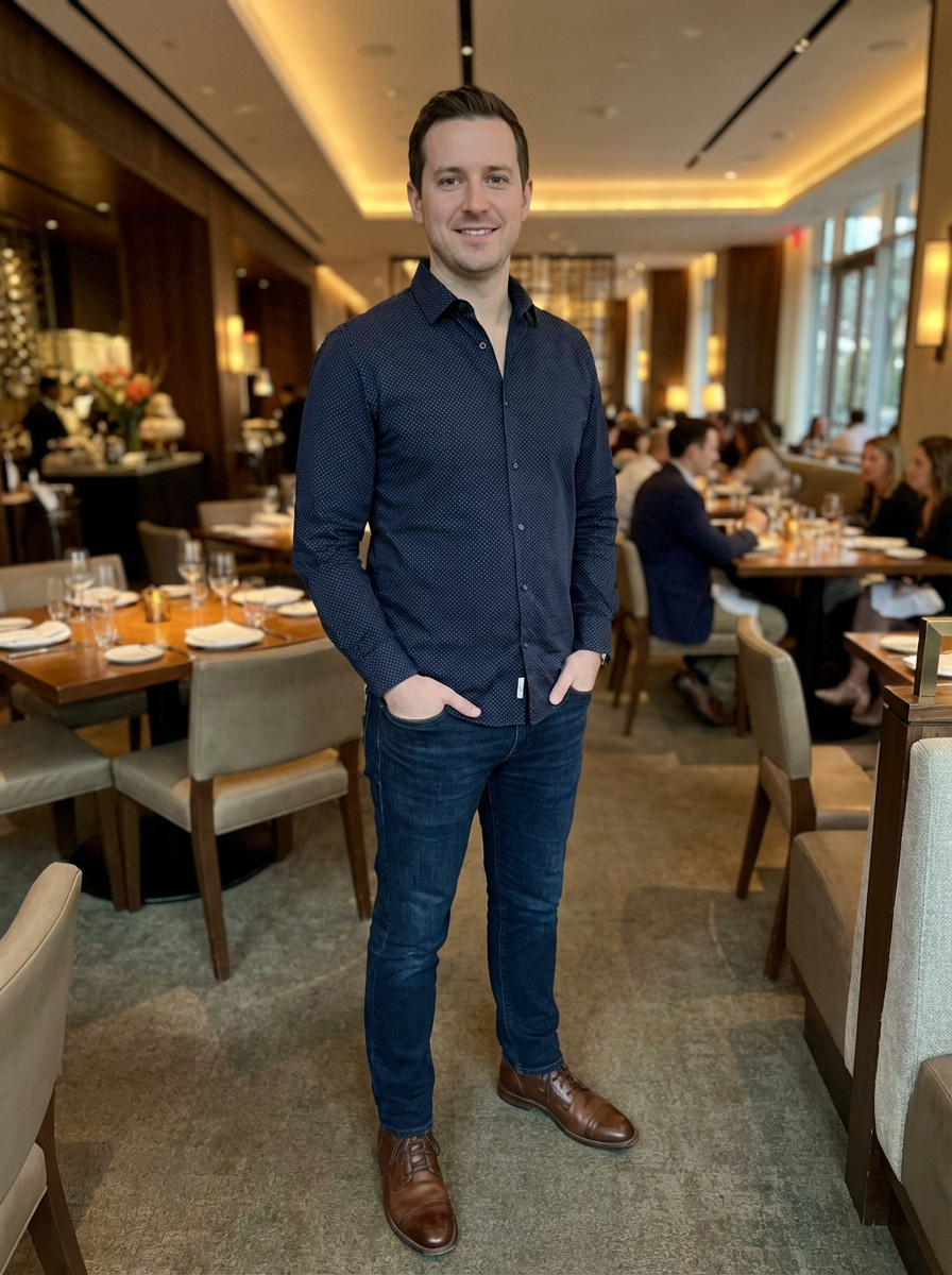 else{model ready for dinner date, dress shirt, dark jeans, relaxed stance, upscale restaurant background}