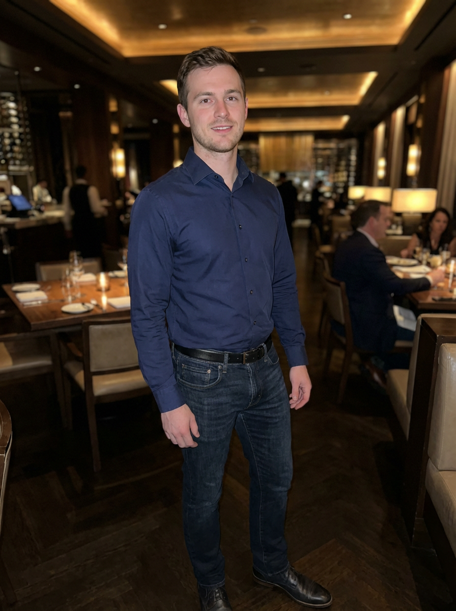 else{model ready for dinner date, dress shirt, dark jeans, relaxed stance, upscale restaurant background}