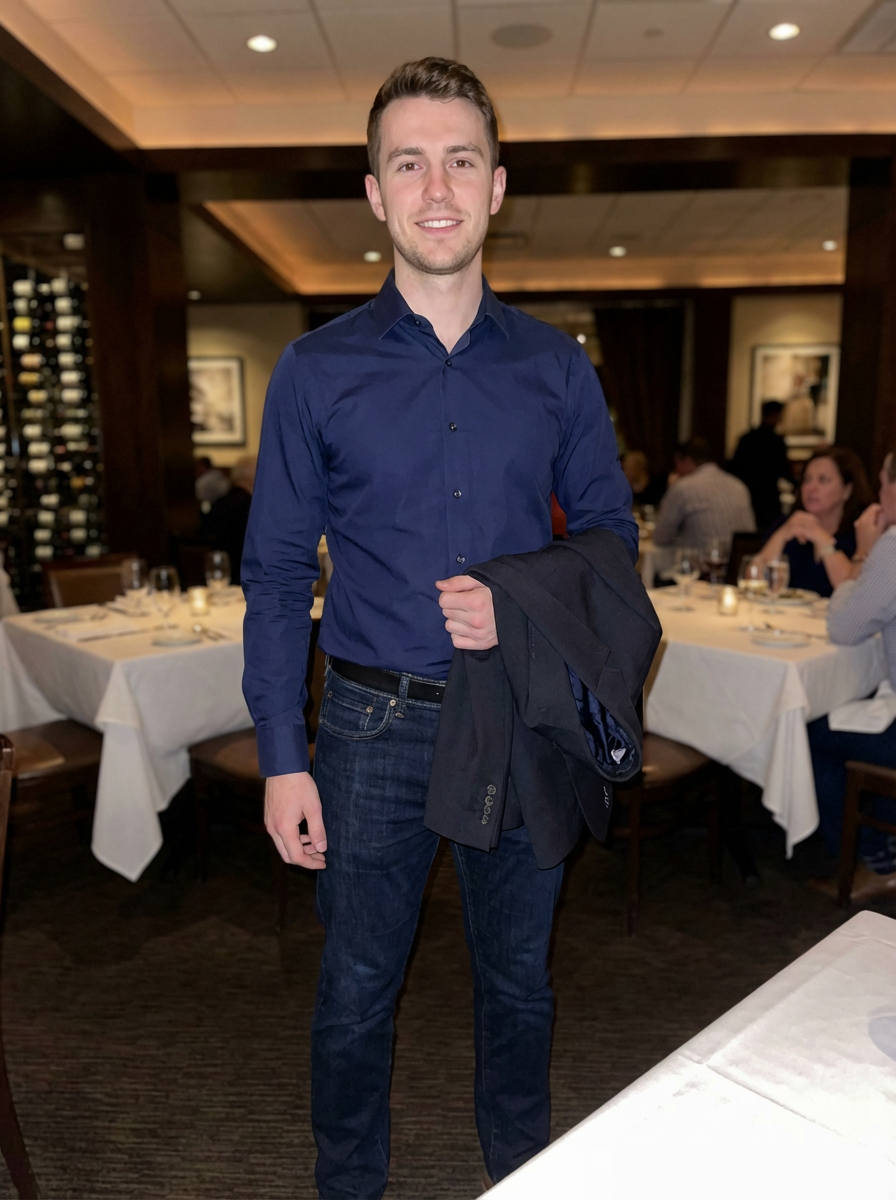 else{model ready for dinner date, dress shirt, dark jeans, relaxed stance, upscale restaurant background}