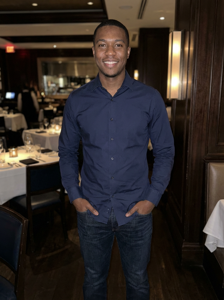 else{model ready for dinner date, dress shirt, dark jeans, relaxed stance, upscale restaurant background}