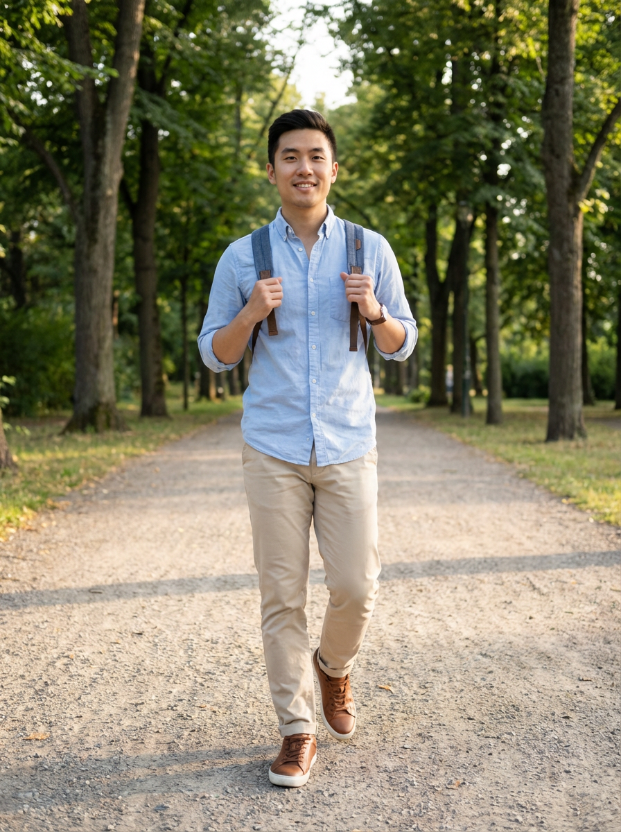 else{model ready for walk in park date, casual shirt, comfortable pants, outdoor path with trees}
