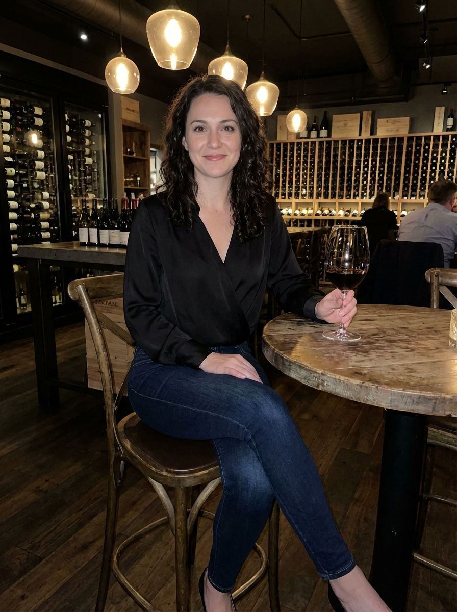 else{model at wine bar first date, stylish top, dark jeans, glass of wine , intimate lighting, sophisticated atmosphere}