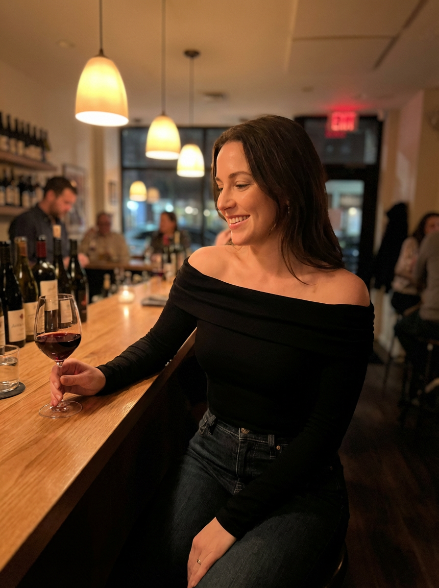 else{model at wine bar first date, stylish top, dark jeans, glass of wine , intimate lighting, sophisticated atmosphere}