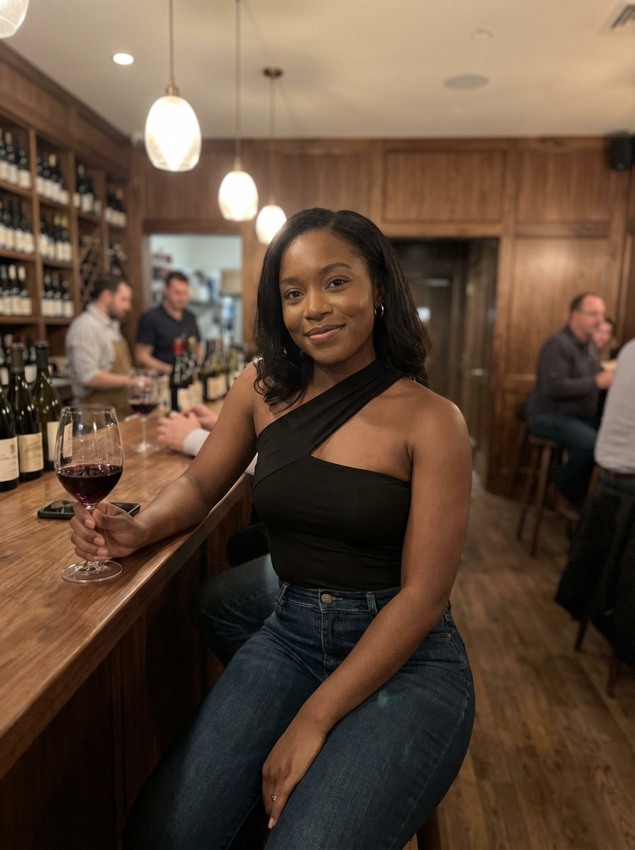 else{model at wine bar first date, stylish top, dark jeans, glass of wine , intimate lighting, sophisticated atmosphere}