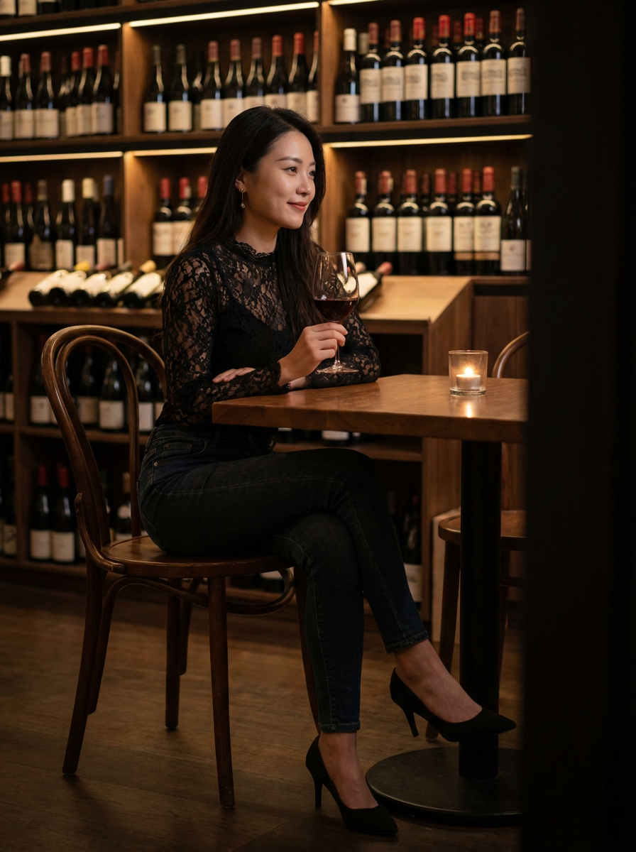 else{model at wine bar first date, stylish top, dark jeans, glass of wine , intimate lighting, sophisticated atmosphere}
