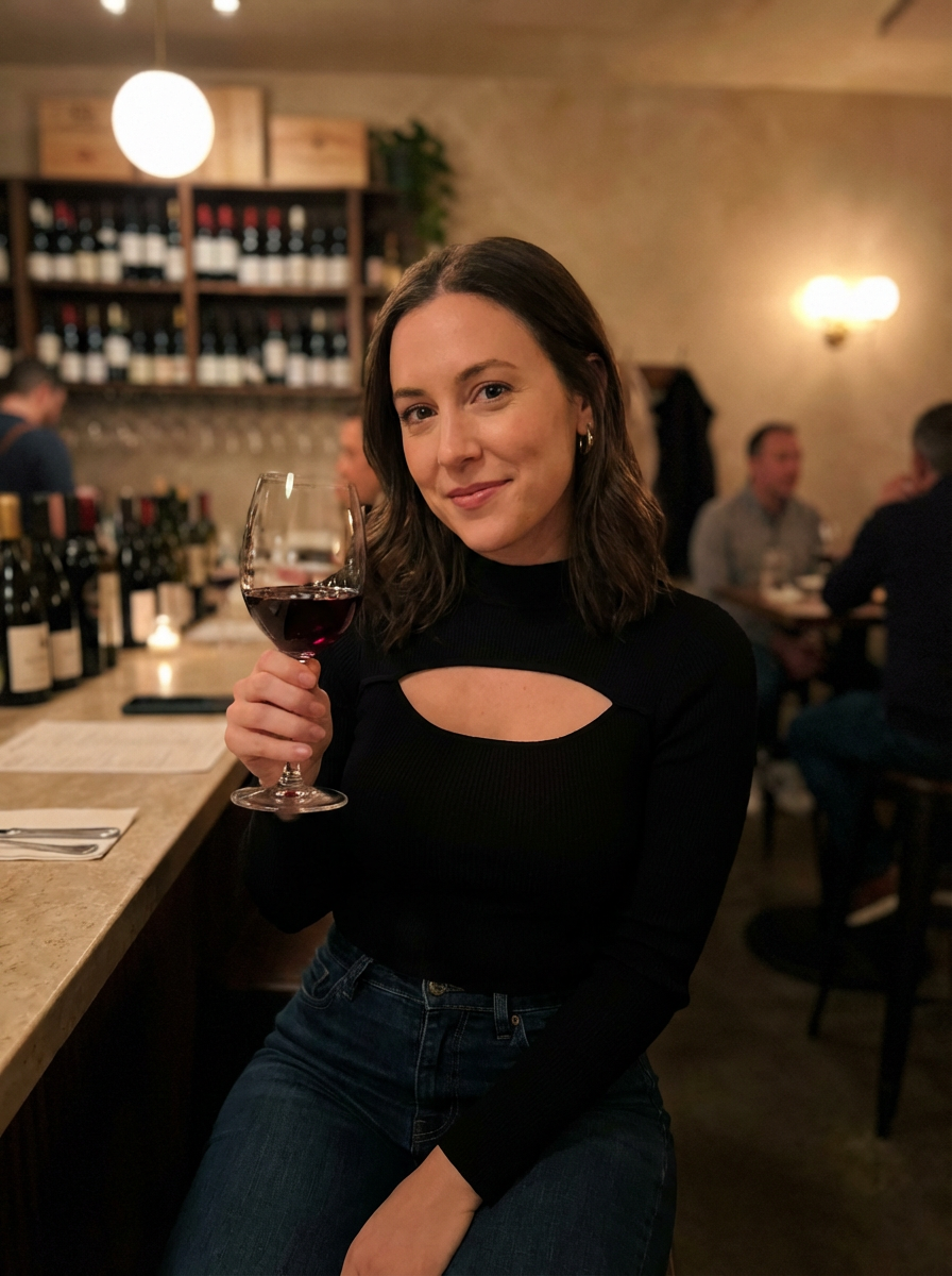 else{model at wine bar first date, stylish top, dark jeans, glass of wine , intimate lighting, sophisticated atmosphere}