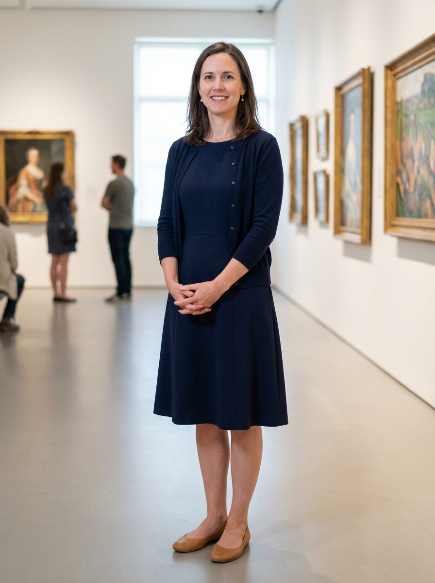 else{model for museum date look, smart casual dress, comfortable flats , art gallery background}