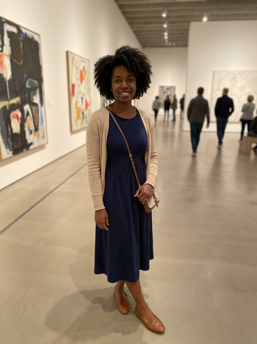 else{model for museum date look, smart casual dress, comfortable flats , art gallery background}