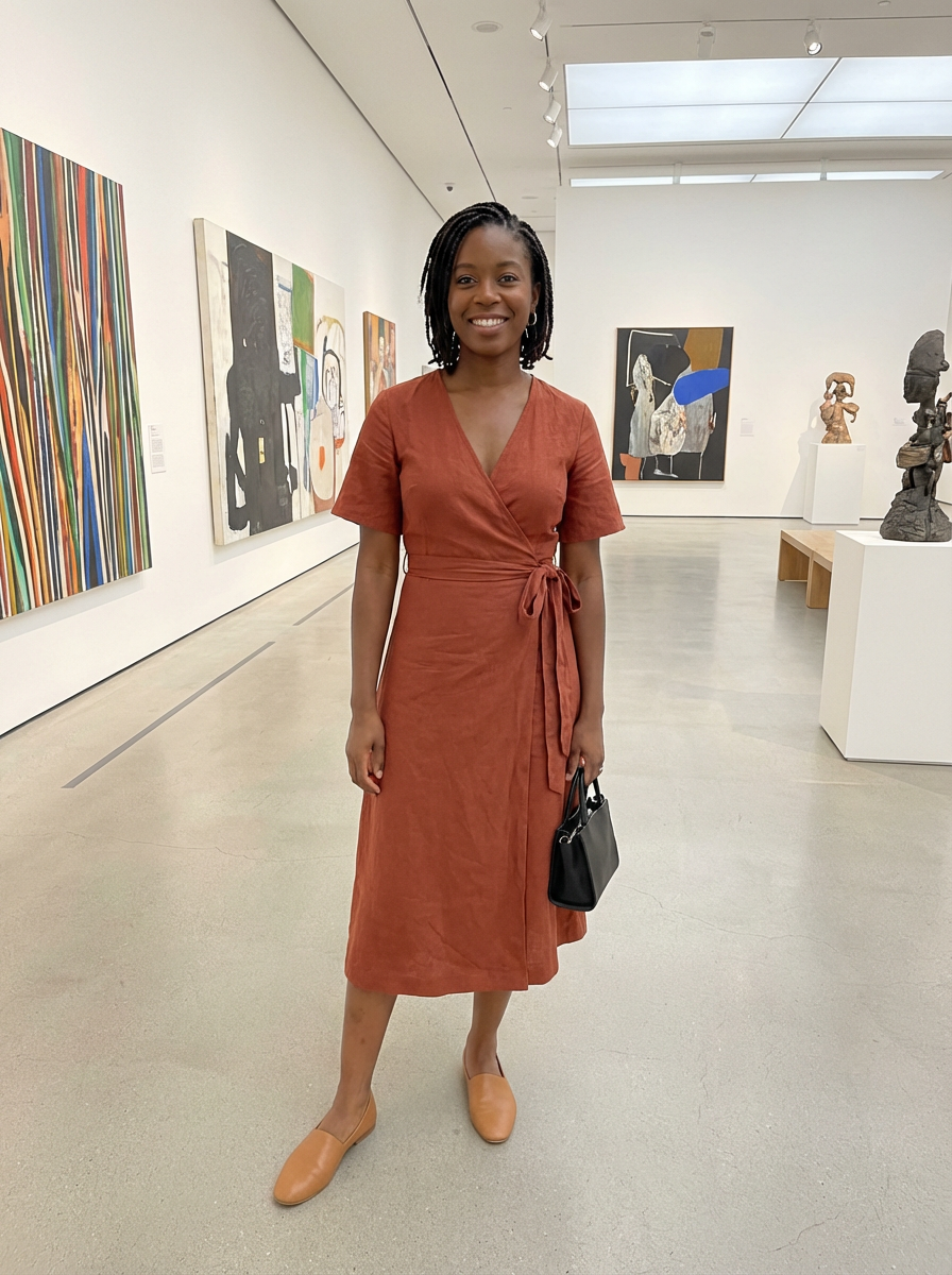 else{model for museum date look, smart casual dress, comfortable flats , art gallery background}