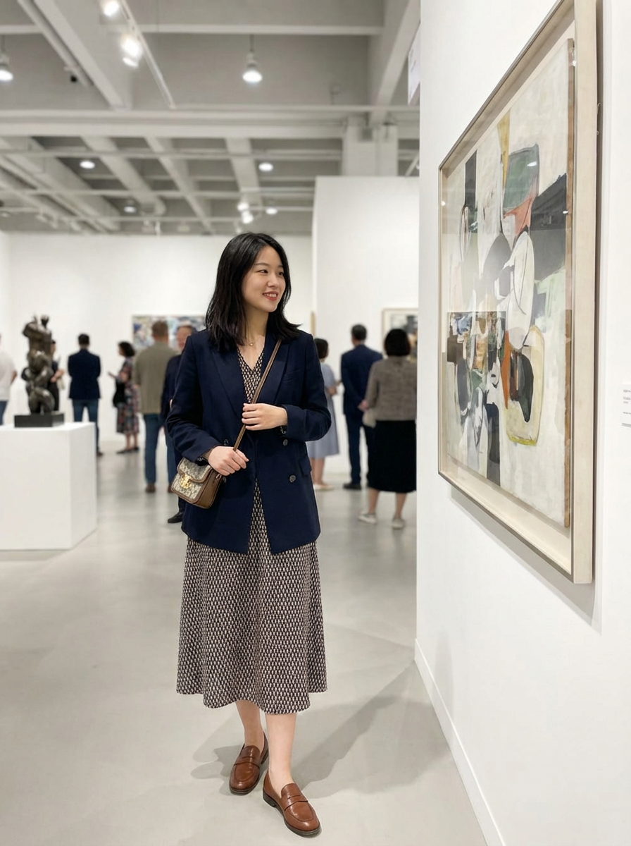 else{model for museum date look, smart casual dress, comfortable flats , art gallery background}