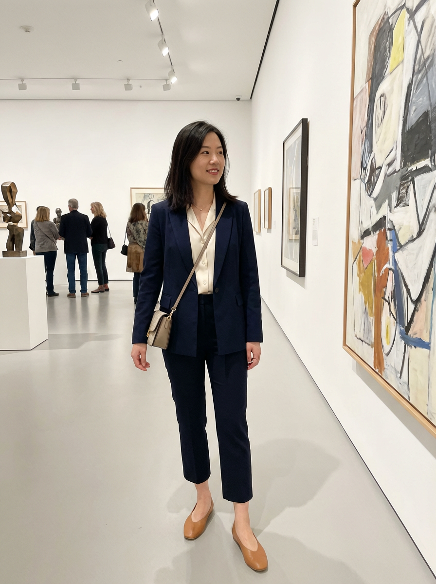 else{model for museum date look, smart casual dress, comfortable flats , art gallery background}