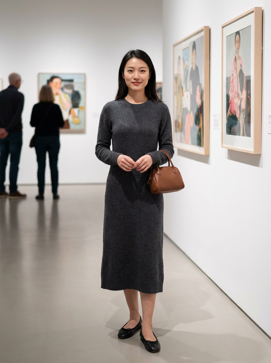 else{model for museum date look, smart casual dress, comfortable flats , art gallery background}