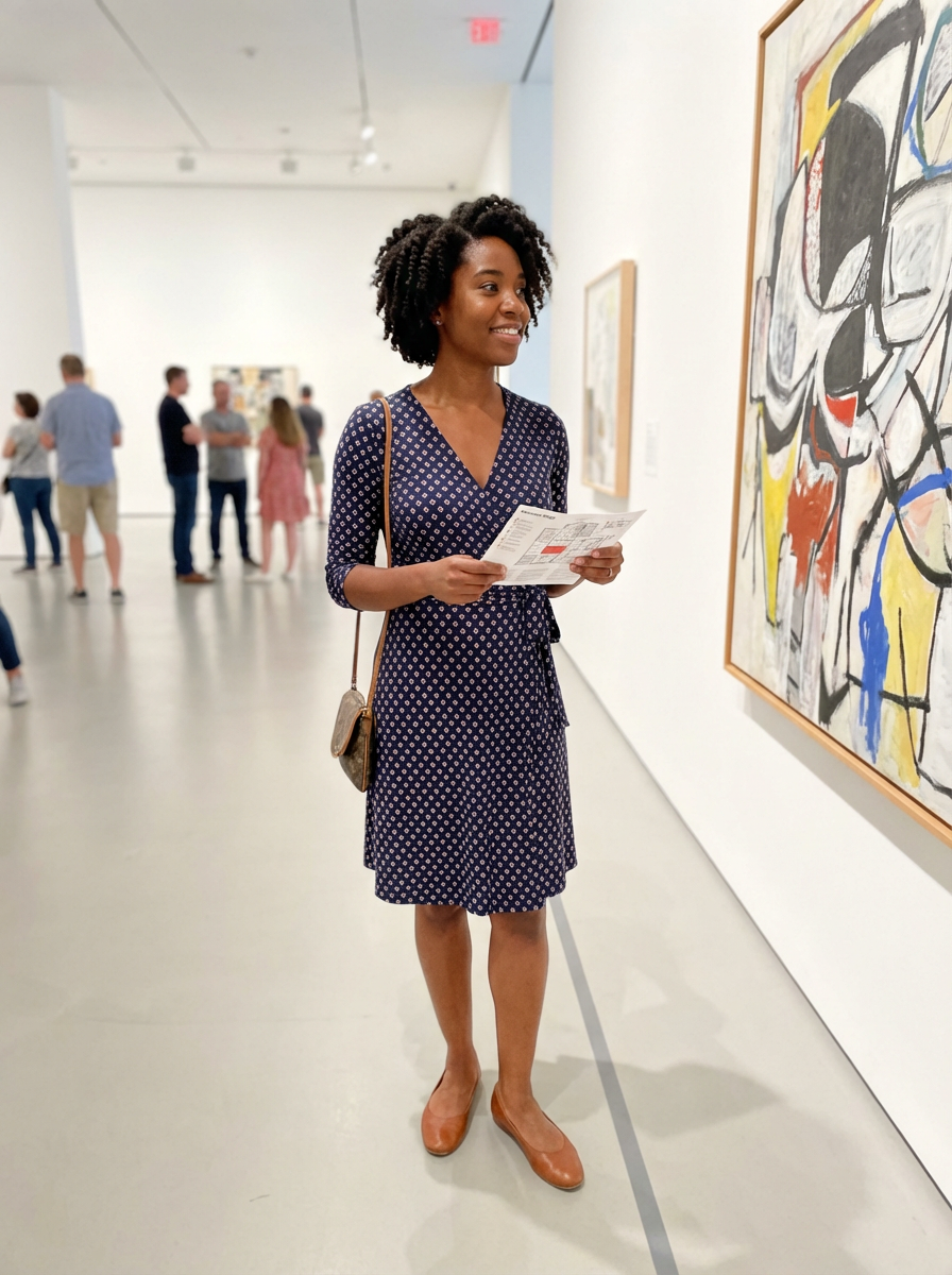 else{model for museum date look, smart casual dress, comfortable flats , art gallery background}