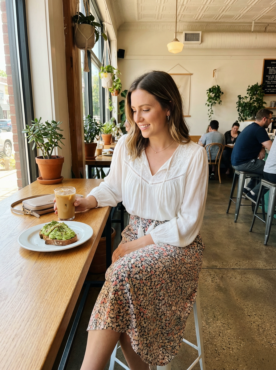 else{model in brunch date outfit, flowy top, cute skirt, natural glow , bright cafe with natural light}
