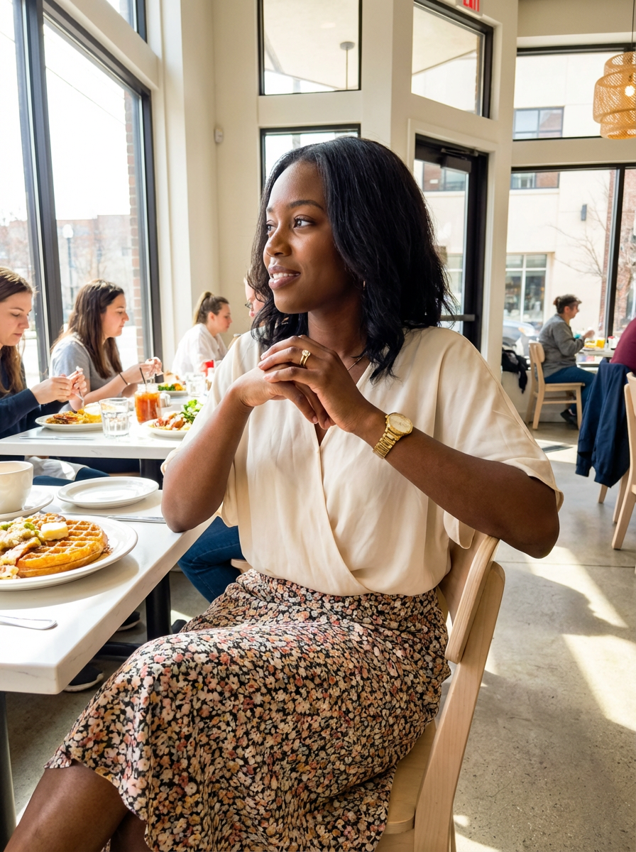 else{model in brunch date outfit, flowy top, cute skirt, natural glow , bright cafe with natural light}