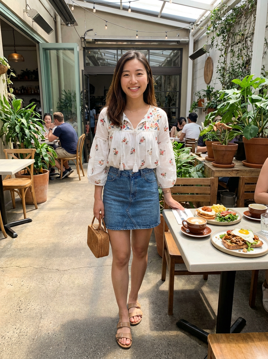 else{model in brunch date outfit, flowy top, cute skirt, natural glow , bright cafe with natural light}