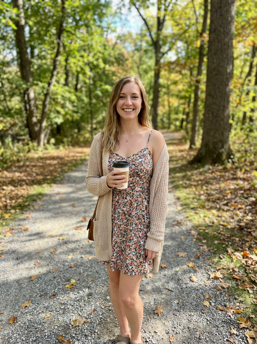 else{model in casual first date look, sundress, cardigan, approachable vibe , park or outdoor setting}