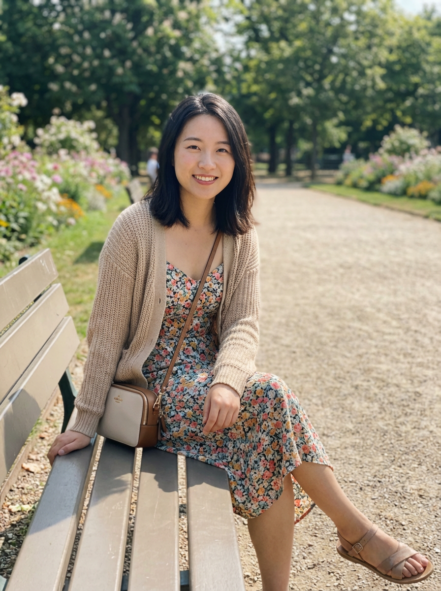 else{model in casual first date look, sundress, cardigan, approachable vibe , park or outdoor setting}