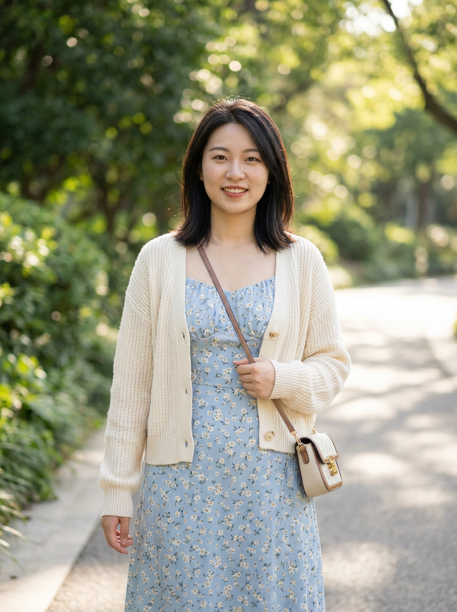 else{model in casual first date look, sundress, cardigan, approachable vibe , park or outdoor setting}