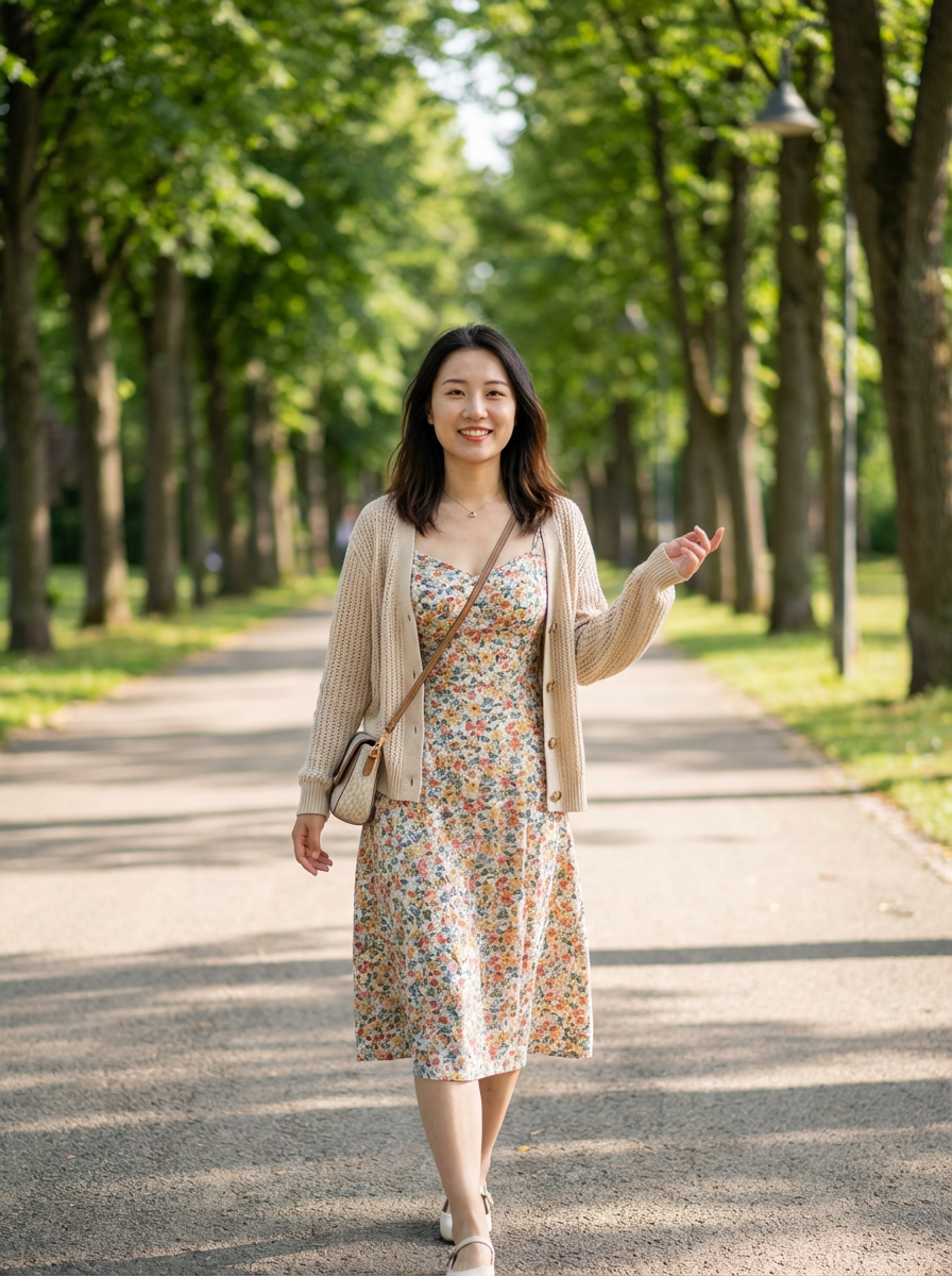 else{model in casual first date look, sundress, cardigan, approachable vibe , park or outdoor setting}